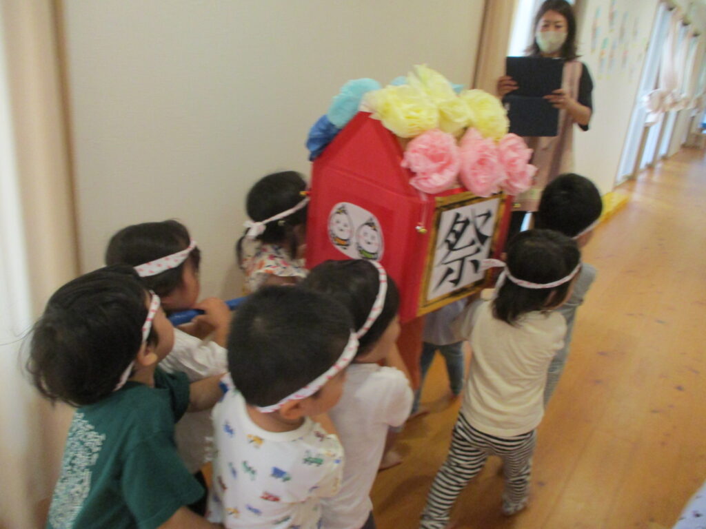 屋台の食べ物やお面を製作したり、お神輿の練習もして、お祭りの日を楽しみにしていました🥰