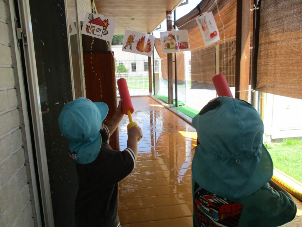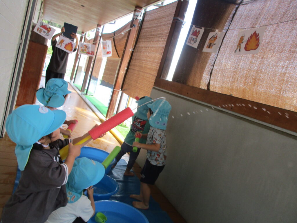 はじめは水鉄砲に苦戦していましたが、やり方がわかると『ウゥ~!』とサイレンの真似をしながら楽しんで火を消していました🥰