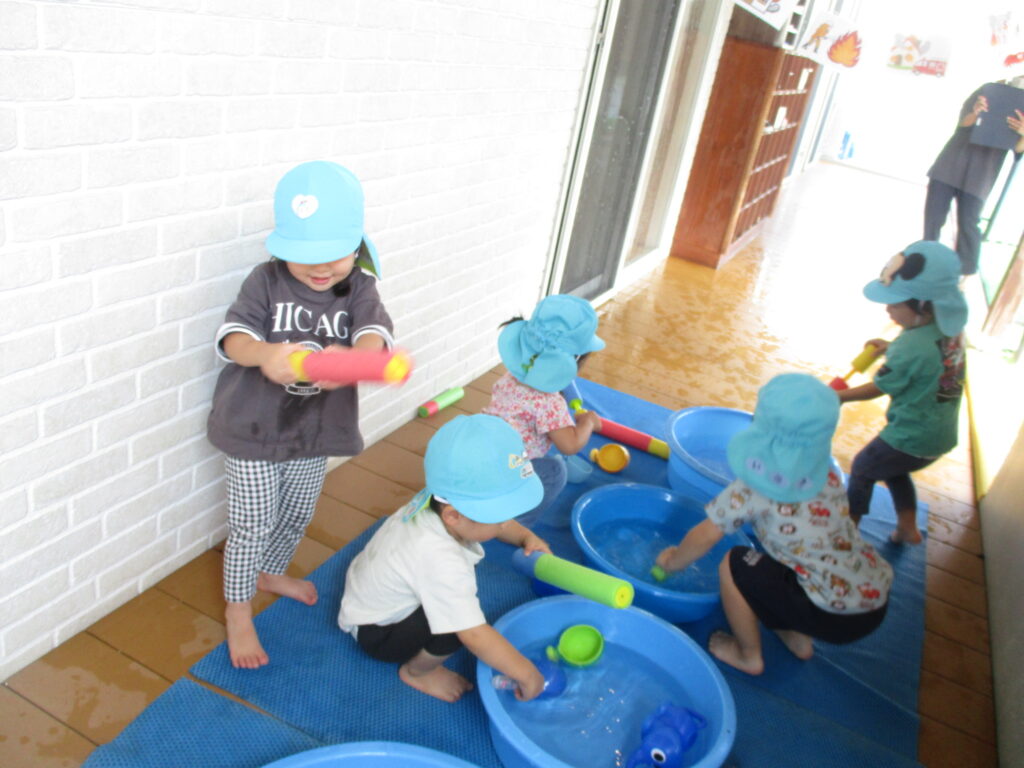 今日の水遊びでは水鉄砲を使って、❝消防士❞になりきって遊びました🎵