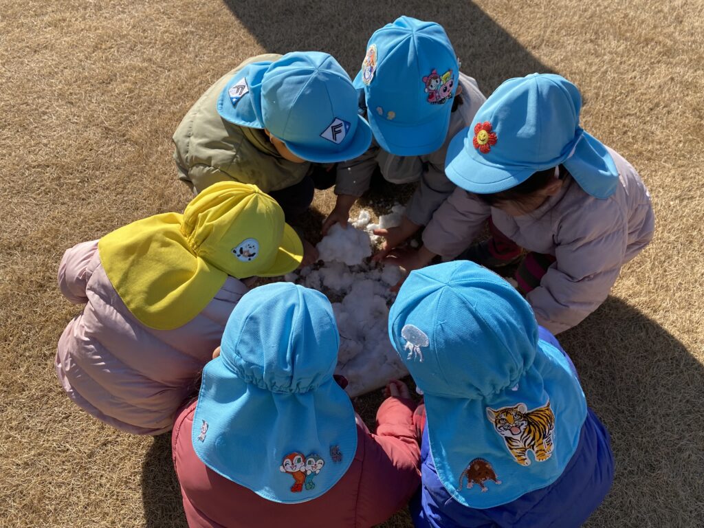 園内に残っていた雪を見つけ、みんなでそーっと集まって雪あそびをしました⛄️